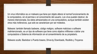 El documento describe diferentes tipos de malware como virus, rootkits y troyanos. También explica sistemas de detección de intrusos (IDS) que monitorean el tráfico de red para detectar ataques. Además, aborda temas de seguridad como gestión de la seguridad de la información, seguridad en sistemas operativos e Internet, y los 15 ataques de seguridad más comunes.