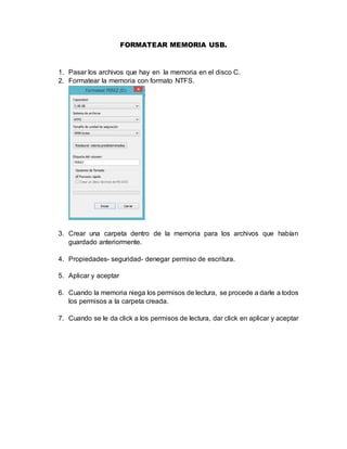 Para formatear una memoria USB, se deben pasar los archivos a otra ubicación, formatear la memoria en formato NTFS, y luego crear una carpeta con permisos de escritura para volver a guardar los archivos originales. Para eliminar un virus, se abre la ventana de ejecución y se escribe "eliminar mugen reparar". Finalmente, para escanear y reparar problemas en el sistema, se utiliza la herramienta ONE CLICK MAINTENANCE para analizar, mostrar un resumen de hallazgos, y reparar todos los problemas detect