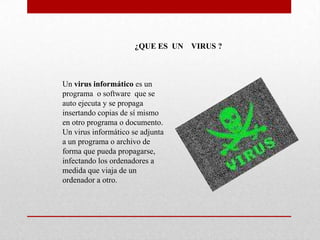 Un virus informático es un software que se autoejecuta y se propaga al infectar otros programas. Existen diversos tipos de virus, como caballos de Troya y gusanos, y los métodos de contagio pueden incluir la interacción del usuario y redes. Los antivirus han evolucionado para detectar, bloquear y desinfectar estos virus, así como otros tipos de malware.