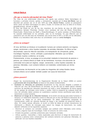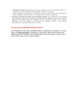El virus Ébola es una enfermedad viral aguda que causa fiebre hemorrágica y tiene una alta tasa de mortalidad entre el 50-95%. Se transmite a humanos por contacto con animales infectados y entre humanos a través de fluidos corporales. No existe una vacuna, por lo que la prevención se basa en la educación pública, el uso de equipo de protección y el aislamiento de pacientes. La actual brote de Ébola en África Occidental se considera una epidemia debido a su rápida propagación entre la población en cin