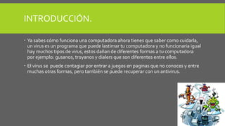 El documento habla sobre los virus computacionales. Explica que un virus es un programa que puede dañar una computadora y hacer que no funcione correctamente. Describe algunos tipos de virus como gusanos y troyanos. Indica que los virus se pueden propagar a través de juegos o páginas web desconocidas, pero que se pueden eliminar con antivirus. El documento asigna a los estudiantes la tarea de hacer un crucigrama y responder preguntas sobre virus, y ofrece recursos en línea para completar la tarea.