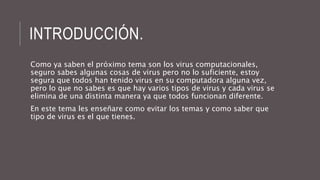 Este documento presenta una tarea sobre virus computacionales. Los estudiantes deben realizar una investigación en parejas sobre los diferentes tipos de virus y sus características, y subirla a su blog en Word antes del 7 de enero. La calificación considerará la puntualidad, calidad del trabajo, imágenes, información clara y aspectos de ortografía. Al final del curso, revisarán los conocimientos adquiridos sobre virus.