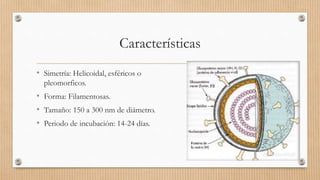 El virus de la parotiditis es un paramixovirus de RNA de cadena simple que causa la enfermedad de la parotiditis. Se caracteriza por ser esférico o filamentoso, de 150-300 nm de diámetro, y tiene un periodo de incubación de 14-24 días. Se replica primero en las vías respiratorias y luego se disemina a las glándulas salivales y otros órganos. Causa inflamación de las glándulas salivales y puede producir meningitis o orquitis en algunos casos. No tiene tratamiento específico, solo medidas