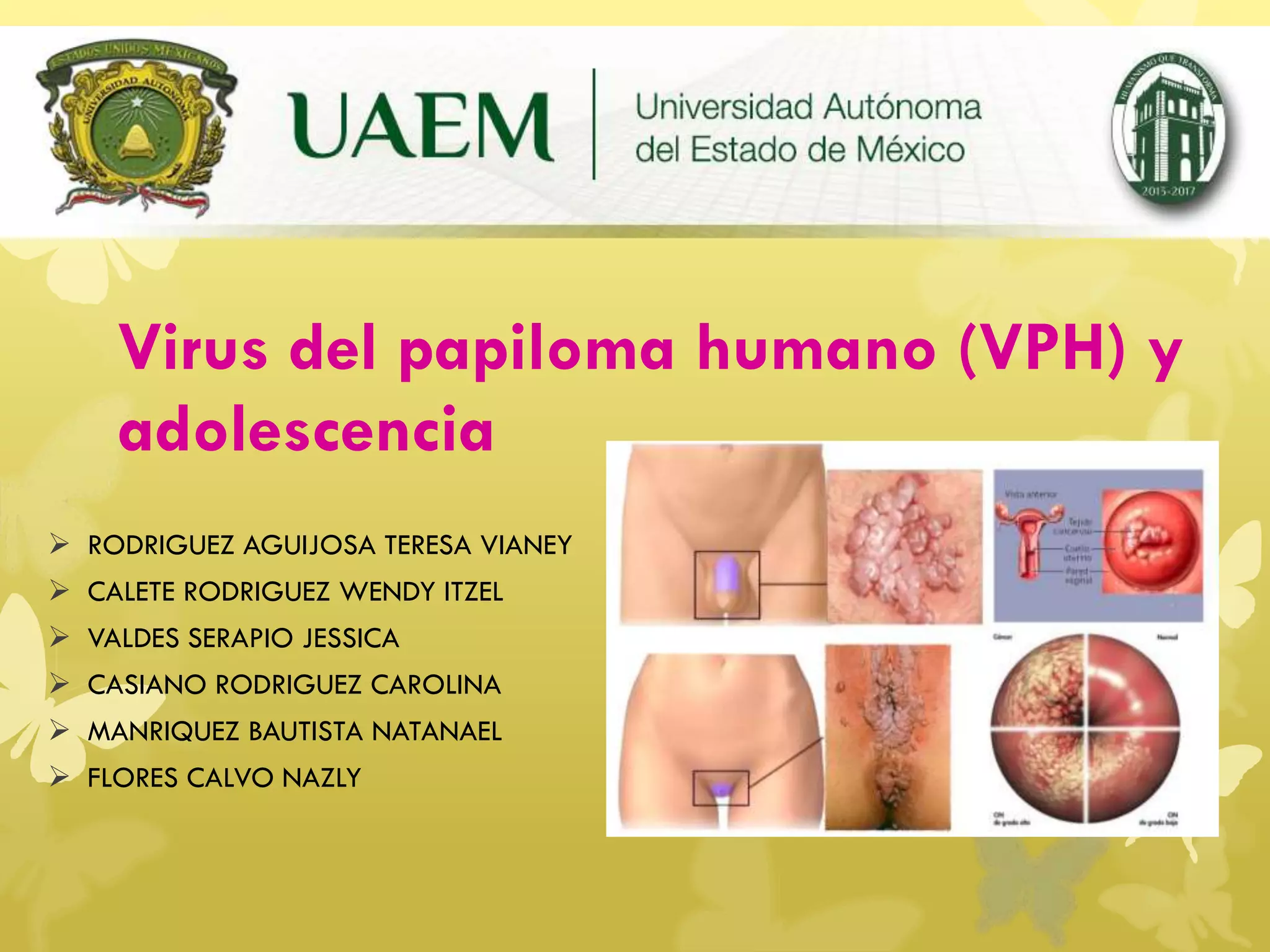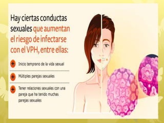 El documento proporciona información sobre el virus del papiloma humano (VPH) y su relación con la adolescencia. Explica que el VPH puede causar verrugas genitales y diferentes tipos de cáncer, incluido el cáncer cervical. Los adolescentes corren un mayor riesgo de contraer el VPH debido a su comportamiento sexual y su sistema inmunológico aún en desarrollo. La educación sexual y el uso de preservativos pueden ayudar a prevenir la transmisión, aunque el preservativo no proporciona una protección comple