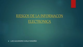 Este documento habla sobre los riesgos de la información electrónica y los virus informáticos. Explica que los virus son programas maliciosos que infectan otros archivos y se replican. Describe el funcionamiento básico de un virus y los tipos más conocidos. También menciona las principales vías de infección como redes sociales y correos no solicitados. Ofrece consejos sobre cómo eliminar virus con guías de detección y mantener protección con antivirus, cortafuegos y sentido común.