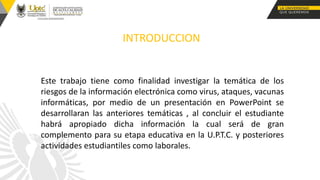 Este documento trata sobre los virus informáticos y las vacunas antivirus. Explica diferentes tipos de virus como los residentes, multipartitos y de acción directa, así como formas en que se propagan los virus a través de redes, correos electrónicos y sitios web. También describe medidas de prevención como mantener actualizados los sistemas operativos y programas, y desconfiar de enlaces y archivos no solicitados. Finalmente, introduce conceptos de vacunas antivirus y sus características de detección y eliminación de virus.