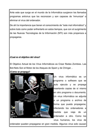 Jon von Neumann propuso en 1949 la posibilidad de que un programa matemático se reprodujera. En 1983, Fred Cohen acuñó el término "virus" para describir un programa informático que se reproduce a sí mismo. Los virus se propagan insertándose en otros programas y documentos y se transmiten de un ordenador a otro. Es importante utilizar software antivirus para detectar y eliminar virus.