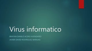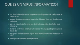 Este documento define qué es un virus informático, cómo se propagan y cómo infectan los sistemas. Explica que un virus es un programa malicioso que se introduce sin permiso en un equipo y puede copiarse a otros equipos o redes de forma similar a como se propagan los virus biológicos. También ofrece consejos para evitar virus como no abrir archivos de fuentes desconocidas y usar software antivirus para eliminar cualquier infección.