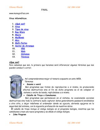 El documento proporciona definiciones y explicaciones sobre diferentes tipos de virus informáticos. Explica que los virus son programas maliciosos que se replican a sí mismos y pueden infectar otros archivos y sistemas. Describe varios tipos específicos de virus como virus de archivo, macro, correo basura, IRC, multi-partes y de sector de arranque. También proporciona una historia sobre el origen del término "error" o "bug" en informática.