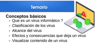 Este documento proporciona información sobre virus informáticos y cómo eliminarlos. Explica qué es un virus informático, cómo se clasifican y cómo se propagan. También describe los efectos y consecuencias de los virus, así como herramientas para visualizar el contenido de un virus. Luego, pasa a discutir antivirus, incluidos tipos de antivirus, comparaciones de software antivirus y cómo seleccionar e instalar un antivirus. Finalmente, cubre temas como actualizar bases de datos antivirus, analizar sistemas para virus y archivos en cuarentena