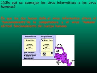 Los virus informáticos y los virus humanos comparten la capacidad de causar daño, aunque los virus informáticos solo pueden dañar datos y sistemas de información, no el hardware. Un virus informático se puede propagar a través de dispositivos de almacenamiento como CDs y memorias USB, incluso a equipos desconectados de Internet. Aunque los antivirus son fiables para eliminar y detener muchos virus, algunos de los virus más dañinos de la historia incluyen el virus Nimba de 2001 y los virus Creeper, Rabbit y MacMag de las dé