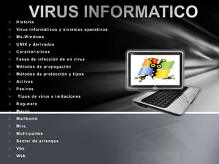 Este documento describe brevemente la historia de los virus informáticos, cómo afectan a diferentes sistemas operativos como Windows, Unix y sus derivados. Explica las características y métodos de propagación de los virus, así como métodos de protección activos como antivirus y pasivos como evitar la introducción de medios extraíbles desconocidos. Finalmente, detalla diferentes tipos de virus e imitaciones como gusanos, macro, correo basura, Mirc, multi-partes, de sector de arranque y Visual Basic Script.