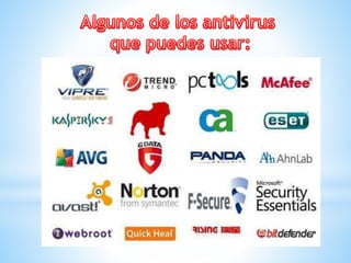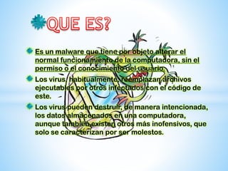 Este documento describe los virus informáticos, incluyendo su naturaleza, características, tipos y formas de propagación. Los virus son programas maliciosos que alteran el funcionamiento de las computadoras sin el permiso del usuario y se propagan al reemplazar archivos ejecutables. Pueden destruir datos e interrumpir sistemas. Existen métodos para prevenir y detectar virus, como el uso de antivirus y filtros de archivos.