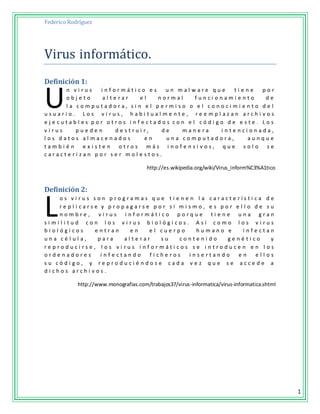 Este documento proporciona definiciones y descripciones de virus informáticos y malware. Explica que un virus informático es un programa malicioso que se replica a sí mismo e infecta otros archivos, y que el malware incluye varios tipos de software dañino como virus, gusanos, troyanos, spyware y ransomware. También describe síntomas comunes de infección viral como archivos alterados, rendimiento reducido y mensajes de error.