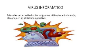 Este documento describe los virus informáticos, sus características y métodos de propagación. Los virus se duplican y extienden a través de copias, causando pérdida de información y daños en los sistemas. Se propagan cuando ejecutamos programas infectados o a través de redes. Para protegernos, se recomiendan usar antivirus y filtros de archivos activamente y evitar ingresar unidades de almacenamiento externas o instalar software pirata pasivamente. Los tipos de virus más comunes son troyanos, gusanos, bombas