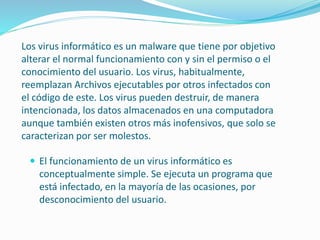 Los virus informáticos son programas maliciosos que se replican a sí mismos y alteran el funcionamiento de los sistemas. Surgen en la década de 1980 y evolucionan para infectar de forma más sofisticada. Los antivirus detectan, desinfectan y bloquean virus, gusanos, troyanos y otros malware mediante firmas, heurística y prevención de infecciones. Planifican la defensa contra emergencias de virus y capacitan al personal para reducir riesgos.