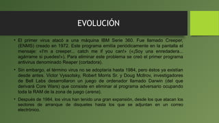 Los virus informáticos se han propagado desde 1972, infectando primero máquinas IBM y luego expandiéndose a través de correos electrónicos y otros métodos. Existen diferentes tipos de virus como troyanos, gusanos y bombas lógicas, que funcionan alterando archivos ejecutables, robando información, o activándose en fechas específicas. Los virus pueden ralentizar los dispositivos, reducir el espacio en el disco, mostrar ventanas constantemente, y corromper archivos vitales.
