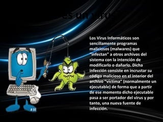 Un virus informático es un programa malicioso que infecta otros archivos en un sistema para modificarlos o dañarlos. El primer virus conocido fue "Creeper", que atacó una computadora IBM en 1972. Los virus habitualmente reemplazan archivos ejecutables con versiones infectadas para propagarse. Pueden destruir datos de forma intencional o ser simplemente molestos.