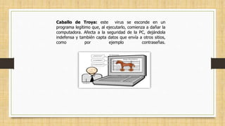 Un virus es un software malicioso que altera el funcionamiento de una computadora sin el permiso del usuario, propagándose a través de otros programas e infectándolos. Los virus pueden dañar o destruir datos de forma intencional, aunque algunos solo causan molestias. Existen diferentes tipos de virus como caballos de Troya, bombas lógicas, hoaxes y virus de enlace o sobreescritura, cada uno con características particulares pero todos con el potencial de causar daños.