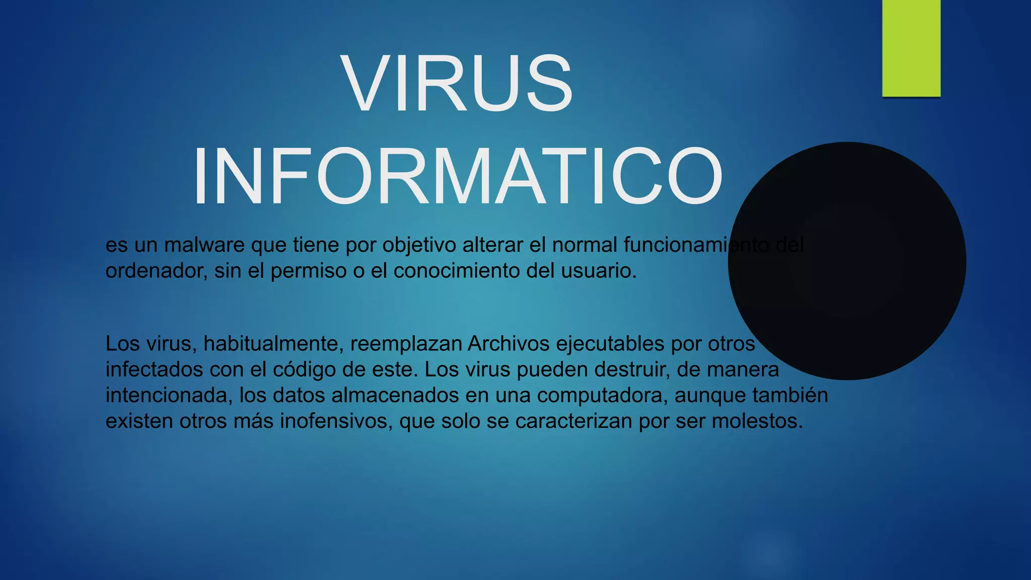 Un virus informático es un malware que altera el funcionamiento del ordenador sin permiso del usuario, reemplazando archivos ejecutables con código malicioso que se replica infectando otros archivos y consumiendo recursos. Puede destruir datos o ser molesto. Se ejecuta cuando el usuario desconoce que un programa está infectado, tomando control del sistema operativo e infectando otros archivos.