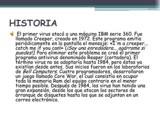 El documento describe la historia y tipos de virus informáticos. Explica que el primer virus, llamado Creeper, atacó una máquina IBM en 1972 y desde entonces los virus han evolucionado para infectar diferentes tipos de archivos y propagarse a través de redes. Describe varios tipos comunes de virus como caballos de Troya, gusanos, virus de macros y virus de sobreescritura, así como sus métodos de propagación e impactos. También ofrece consejos sobre cómo prevenir infecciones virales a través de software antivirus y copias de segur