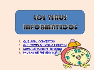 El documento habla sobre conceptos de virus informáticos, los tipos que existen como troyanos, gusanos, bombas lógicas, virus de broma, hoaxes y virus macro. Explica cada tipo de virus, cómo funcionan y se propagan. También da consejos sobre cómo prevenirlos mediante el uso de antivirus actualizados, desactivar el restaurador de sistemas y pasar el antivirus diariamente.