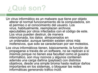 Un virus informático es un programa malicioso que se propaga a través de otros programas y tiene como objetivo alterar el funcionamiento normal de la computadora sin el permiso del usuario. Funciona ejecutándose de forma oculta y aprovechando vulnerabilidades de los sistemas operativos para infectar otros archivos y replicarse, pudiendo causar daños como destruir datos o ralentizar el sistema. Existen diferentes tipos de virus como troyanos, gusanos y bombas lógicas, y se propagan principalmente a través de archivos ejecutables
