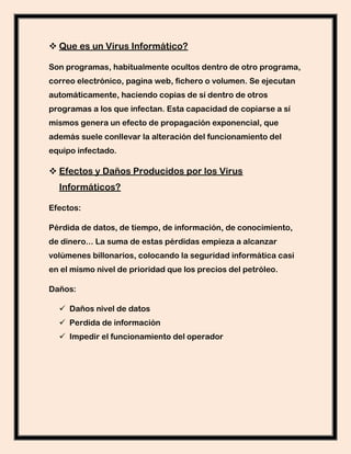 Este documento resume los principales tipos de virus informáticos y sus características. Explica que los virus son programas ocultos que se replican a sí mismos y dañan computadoras. Describe varios tipos de virus como virus de sector de arranque, virus de sistema, virus de archivo y virus de macro. También cubre medidas de prevención como el uso de antivirus y la importancia de realizar copias de seguridad.
