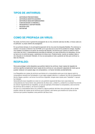 Este documento describe los virus informáticos, sus tipos, y cómo se propagan. Explica que un virus es un programa creado para causar daño a un ordenador. Detalla diferentes tipos de virus como de sector de arranque, de sistema, parásitos, de macro, polimórficos y anexados. También describe antivirus y cómo se usan los respaldos para proteger archivos.