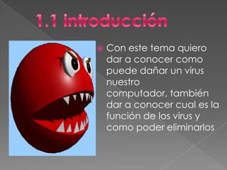 Este documento resume los tipos de virus informáticos, cómo prevenirlos y eliminarlos, y describe tres virus específicos. Explica que los virus son programas que se replican a sí mismos e infectan otros programas, clasificándolos en caballos de Troya, gusanos y bombas lógicas. Recomienda mantener actualizado el software y usar programas antivirus gratuitos para eliminar virus y evitar su instalación. Describe brevemente los virus de boot, hijackers y zombies como ejemplos.