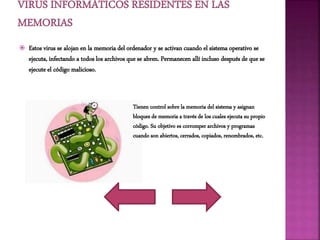 Los virus informáticos se alojan en la memoria del ordenador y se activan al ejecutar el sistema operativo, infectando archivos y corrompiendo su contenido. Estos virus pueden restringir el acceso a secciones del disco y se caracterizan por su capacidad de replicarse y sobreescribir archivos sin mantener su tamaño. Existen virus específicos, como los macro virus, que afectan a documentos de aplicaciones con macros y utilizan algoritmos de cifrado para evadir detección por software antivirus.