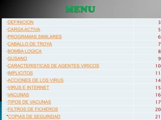 El documento habla sobre los virus de computadora, definidos como programas que se reproducen a sí mismos e interfieren con el hardware o sistema operativo de forma dañina. Explica que los virus deben cargarse activamente en la memoria para seguir sus instrucciones de reproducción y evasión. También describe diferentes tipos de virus como caballos de Troya, bombas lógicas y gusanos, e indica que sus acciones pueden incluir dañar archivos, mostrar mensajes o causar fallas. Por último, resume los métodos para prevenir infecciones virales como el