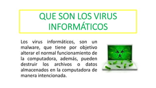 Este documento describe diferentes tipos de virus informáticos y cómo prevenirlos y enfrentarlos. Explica que los virus son programas maliciosos que alteran el funcionamiento de las computadoras y pueden destruir archivos. Recomienda usar antivirus actualizados, no descargar archivos sospechosos, y mantener el software al día. Luego enumera siete tipos comunes de virus como gusanos, troyanos, camaleones, conejos, polimorfos, bombas lógicas y retrovirus.