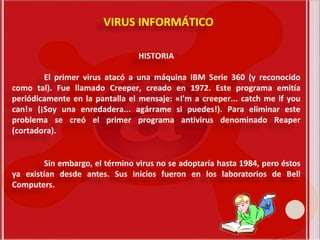 El documento proporciona información sobre virus informáticos, incluyendo su historia, tipos, formas de propagación y cómo eliminarlos. Explica que el primer virus reconocido fue Creeper en 1972 y que los términos virus no se adoptaron hasta 1984. Describe varios tipos de virus como troyanos, gusanos y bombas lógicas, así como formas comunes de propagación como correo electrónico y redes sociales. Ofrece consejos sobre cómo actualizar software y usar programas antivirus para eliminar virus e impedir su instalación.