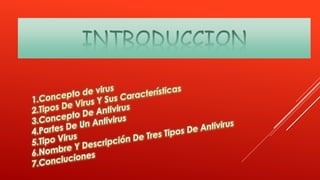 Los virus informáticos causan efectos dañinos y peligrosos como robo y pérdida de datos. Existen varios tipos de virus como troyanos, macros, gusanos y falsos. Los antivirus son programas que previenen y eliminan virus mediante la detección de firmas en su base de datos y el monitoreo de actividades sospechosas.