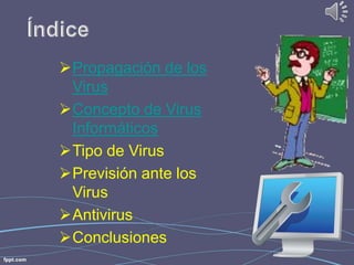 Este documento habla sobre los virus informáticos, incluyendo su concepto, tipos, cómo se propagan y cómo prevenirlos. Explica que los virus son programas creados para interferir o dañar computadoras e infectar otras de forma similar a cómo los virus biológicos infectan humanos, con efectos que van desde leves hasta devastadores. También señala que tomar precauciones y usar antivirus puede reducir el impacto de los virus.