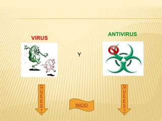 El documento describe los virus informáticos, su historia, tipos y funcionamiento. Explica que los virus son programas maliciosos que se propagan sin el permiso del usuario y pueden dañar datos o sistemas. También describe los antivirus, programas diseñados para detectar y eliminar virus. El primer virus conocido atacó una computadora IBM Serie 360 en 1972.