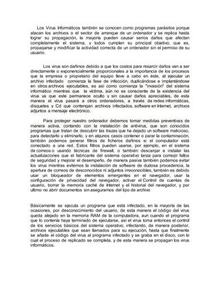 Los virus informáticos se replican hasta propagarse, modificando la actividad de un ordenador sin permiso y causando daños. Para protegerse, es importante instalar antivirus y actualizaciones, evitar software de dudosa procedencia, y no abrir archivos adjuntos de desconocidos. Básicamente, un programa infectado ejecuta el código viral, el cual queda oculto en la memoria RAM e infecta otros archivos ejecutables, replicándose hasta añadirse al programa y grabarse en el disco, completando así su propagación.