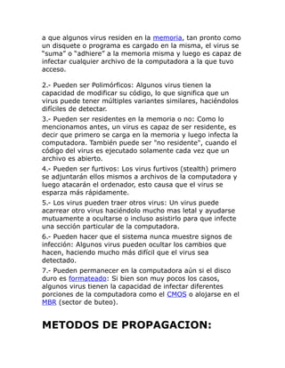 Un virus es un malware que se propaga a sí mismo infectando otros archivos y tiene la capacidad de alterar el funcionamiento del ordenador sin el permiso del usuario. Puede destruir datos o simplemente causar molestias. El primer virus conocido atacó una computadora IBM en 1972 y desde entonces los virus se han vuelto más sofisticados, pudiendo ocultar su presencia, infectar múltiples archivos y propagarse a través de redes. Los usuarios deben tener cuidado de no ejecutar archivos sospechosos o de abrir correos electr