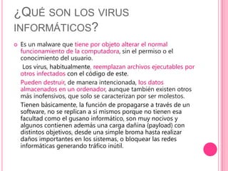 Los virus informáticos son malware que alteran el funcionamiento de las computadoras sin el permiso del usuario, propagándose a través de programas infectados. Algunos pueden destruir datos o causar daños, mientras que otros solo son molestos. Los antivirus detectan y eliminan virus mediante el reconocimiento de sus trazas en el sistema para contener la infección y notificar al usuario.