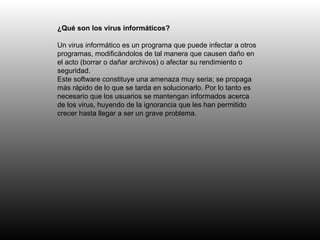 Un virus informático es un programa malicioso que puede infectar otros programas y modificarlos para causar daños como borrar o dañar archivos. Existen diferentes tipos de virus como caballos de Troya, gusanos, virus de macros, virus de sobreescritura y virus residentes. Los virus se propagan rápidamente a través de redes y copias de archivos infectados, lo que puede ocasionar pérdida de datos, tiempo de inactividad y otros problemas. Es importante que los usuarios se mantengan informados sobre los virus para evitar ser infectados.