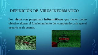 Este documento define los virus informáticos, describe cómo infectan los computadores y cómo se propagan. Explica que los virus tienen como objetivo alterar el funcionamiento del computador sin que el usuario se de cuenta. Se detalla que los principales métodos de infección son archivos adjuntos en correos electrónicos, sitios web sospechosos y USBs infectados. También resume los tipos de virus más comunes como gusanos, troyanos y hoaxes, y los antivirus creados para detectarlos y eliminarlos.