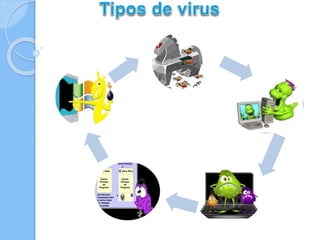 Un virus informático es un programa malicioso que se propaga a sí mismo sin el permiso del usuario y puede dañar la computadora. El primer virus conocido fue Creeper creado en 1972, el cual se propagaba entre computadoras IBM 360. Posteriormente se creó el primer programa antivirus llamado Reaper. Los virus se han expandido mucho desde 1984 y pueden reemplazar archivos, propagarse a través de software y destruir datos.