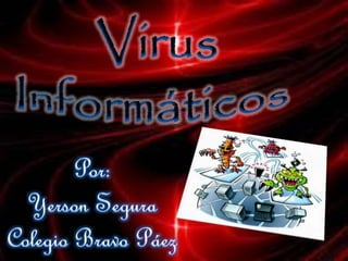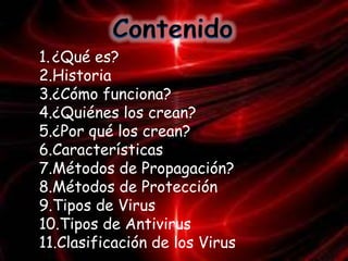 Este documento describe los virus informáticos, incluyendo su historia, cómo funcionan, quiénes los crean y por qué, sus características, métodos de propagación, tipos y formas de protegerse de ellos. Explica que los virus son programas maliciosos que alteran el funcionamiento de las computadoras e infectan otros archivos y cómo los antivirus detectan y eliminan estas amenazas.