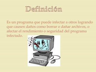 El documento describe diferentes tipos de virus informáticos, incluyendo virus que infectan archivos adjuntos, virus residentes, virus de sector de arranque, y cómo se transmiten comúnmente a través de correos electrónicos con archivos adjuntos. También discute los daños que pueden causar los virus y la importancia de mantener los antivirus actualizados para detectarlos.