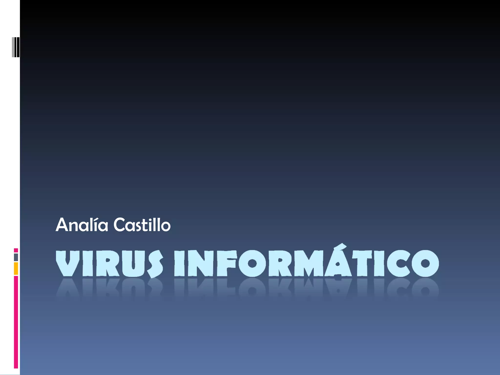 Un virus informático es un programa malicioso que se propaga a sí mismo sin el permiso del usuario y puede dañar los sistemas. Los primeros virus aparecieron en la década de 1970 y se han vuelto más comunes desde la década de 1980, propagándose a través de disquetes, correos electrónicos y redes. Los virus causan problemas como pérdida de productividad, fallas de sistemas e información dañada. Existen métodos activos como antivirus y filtros de archivos, y métodos pasivos como evitar medios externos