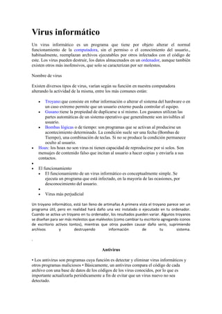 El documento describe los diferentes tipos de virus informáticos, incluyendo troyanos, gusanos, bombas lógicas y hoaxes. Explica que un virus infecta programas y se propaga sin el conocimiento del usuario, pudiendo dañar o borrar datos. También menciona algunos antivirus comunes como AVG, Avast, Kaspersky y Microsoft Security Essentials que detectan y eliminan virus mediante la comparación de códigos.