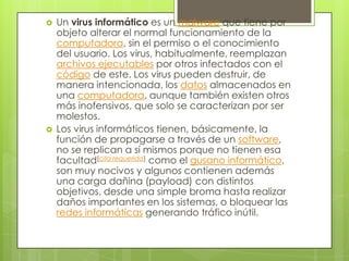 Un virus informático es un malware que altera el funcionamiento de una computadora sin el permiso del usuario, replicándose e infectando archivos ejecutables. Los virus pueden destruir datos o simplemente ser molestos. Funcionan alojándose en la memoria RAM y tomando control del sistema operativo para infectar otros archivos ejecutables y replicarse en el disco. Pueden causar pérdida de productividad, cortes de sistemas e información o daños a datos.