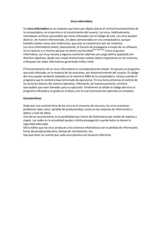 Un virus informático es un malware que altera el funcionamiento de una computadora sin el permiso del usuario, reemplazando archivos ejecutables con código malicioso. Los virus se propagan a través de software infectado y toman control de los servicios del sistema operativo para infectar otros archivos. Esto permite que el virus se replique al agregar su código a programas y grabarlos en el disco. Los virus consumen recursos y pueden causar problemas como pérdida de productividad, fallas de sistemas e información, o daños a través de su disemin