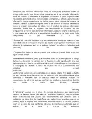 Los virus informáticos son programas maliciosos que se reproducen por sí mismos y toman control de las computadoras, causando problemas como pérdida de datos e interrupciones. Los firewalls filtran la información que entra y sale de una red privada para protegerla. Los hackers usan sus habilidades informáticas de manera positiva o negativa como crackers para romper sistemas de seguridad.